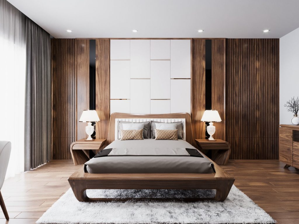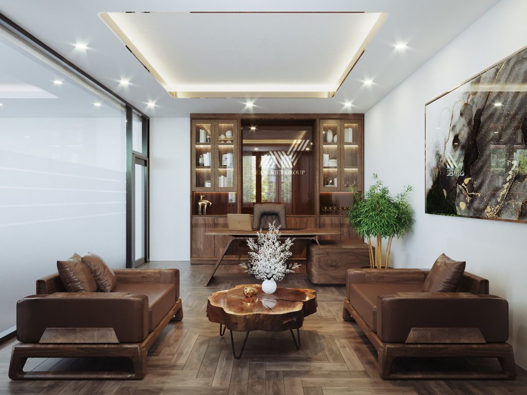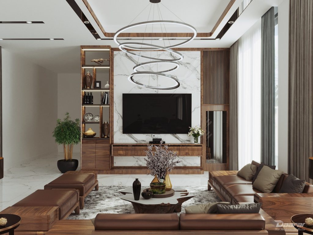 Sự kết hợp tinh tế giữa gỗ tự nhiên và MDF mang lại không gian nhà khách sang trọng